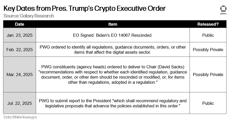 The lack of specificity in the EO on the “strategic bitcoin reserve” (SBR) caused Bitcoin to dip on the release of the order, with many in the bitcoin community upset at the use of the term “digital assets.” If we're keeping score, studying and creating the stockpile but not buying it is explicitly is what we predicted would happen in our 2025 predictions report, where Galaxy Research wrote on Dec. 27, 2024: “The U.S. government will not purchase Bitcoin in 2025, but it will create a stockpile using coins it already holds, and there will be some movement within the departments and agencies to examine an expanded Bitcoin reserve policy.” We don’t know if a more expanded reserve policy that includes purchases will be enacted, or which coins (if any) will become part of a national stockpile, but for now the content of this executive order is exactly what we expected. There’s still a lot of time for more to happen – after all, it’s only day three of Trump’s second presidency. In any case, we view a stockpile alone as extremely bullish.