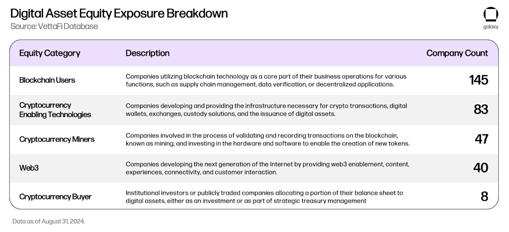 As the regulatory environment improves, we believe there are dozens of blockchain-related companies looking to go public, joining the roster of public companies already operating in the digital asset space. As of this writing, we track over 320 public companies across different categories as shown below.1[1] Most of the direct exposure to crypto with current public equities is found with bitcoin mining companies (e.g. RIOT), companies that hold bitcoin on the balance sheet (e.g. MSTR), or financial services companies that facilitate cryptocurrency trading and/or payments (e.g. COIN). Some investors may want to get exposure to the digital asset space through equities given they trade on regulated exchanges. This is also true for derivatives on these equities and ETFs.