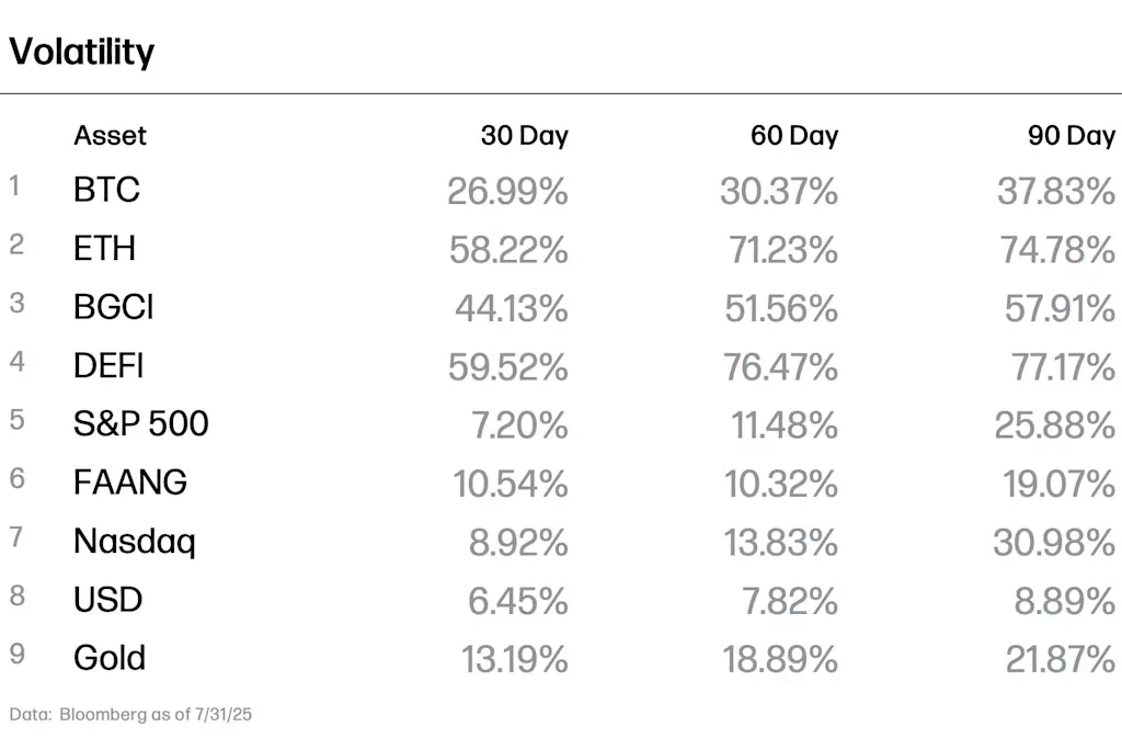 The current market cycle has yet to exhibit full-scale alt season characteristics. The Bloomberg Galaxy Crypto Index (BGCI) returned 26% in July, exceeding BTC’s 8% gain but falling short of ETH’s sharp 49% rally. This suggests that ETH’s outperformance was more idiosyncratic than indicative of the arrival of an altcoin season.