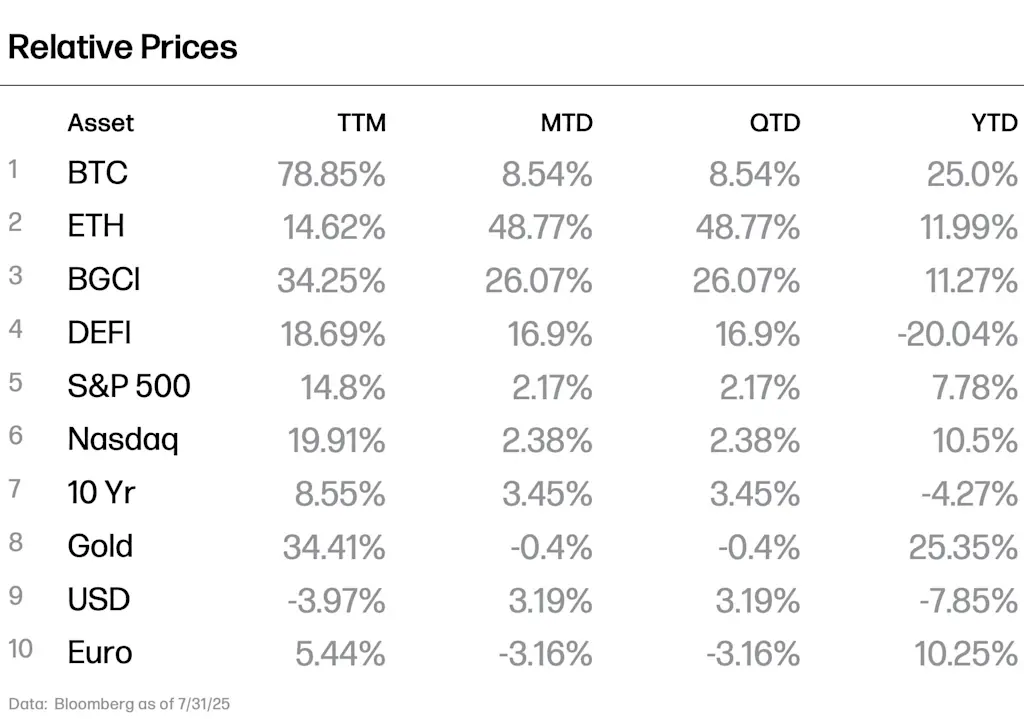 BTC rallied to a new all-time high of $123,000 while ETH posted a 49% gain in July. This broad-based strength was underpinned by growing regulatory clarity and institutional adoption.