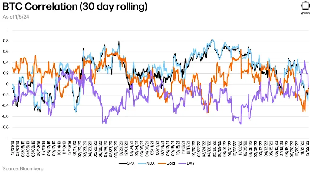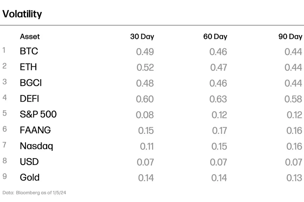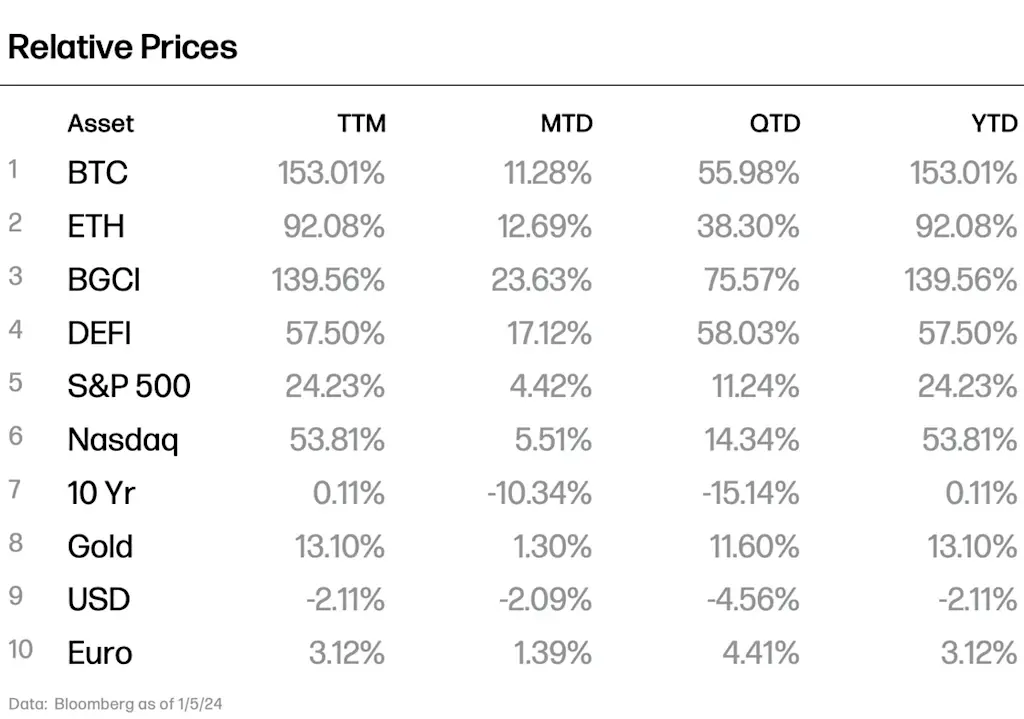 Considering the challenges faced by the crypto industry in 2022, the past year’s price performance exceeded many expectations. Looking ahead, three significant events loom. First, the anticipation of a spot BTC ETF—which drove much of bitcoin's price performance in 2023—has been greater than ever. It is expected that an SEC approval may occur any day now and is expected to potentially lead to substantial net new inflows into bitcoin. Second, the Bitcoin halving, as we’ve mentioned in previous newsletters, will occur for the fourth time in April. Third, potential interest rate cuts by the Federal Reserve should help set the stage for a promising year for the crypto space.