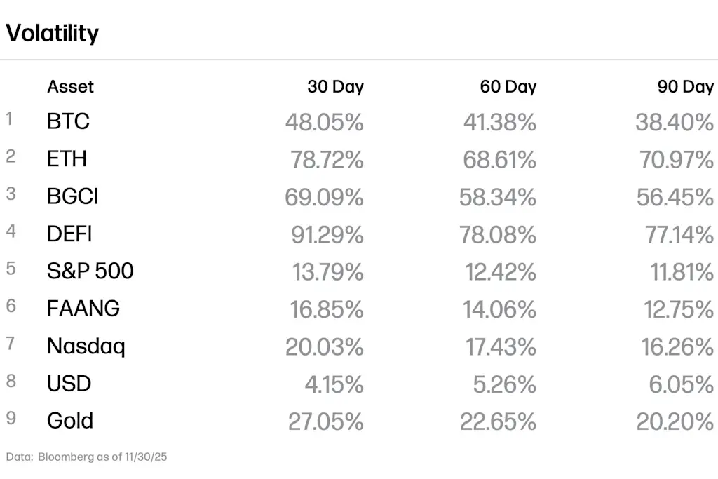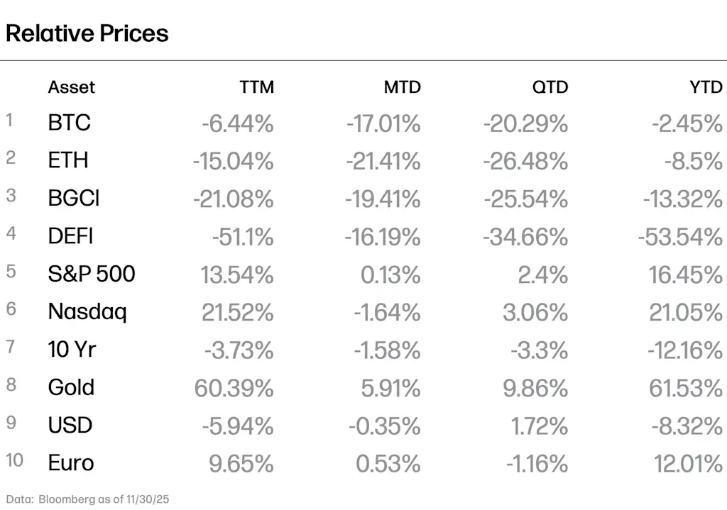After one of the weakest Octobers on record, BTC began November above $109,000 but ended the month below $92,000. Broader crypto markets followed suit, with ETH falling to $3,000 from $3,800. The crypto market’s decline was punctuated by two distinct waves of selling represented through BTC’s price actions: an initial 8% drop in the first week, followed by a prolonged 7% slide from Nov. 10-22 that brought BTC down to roughly $84,000.