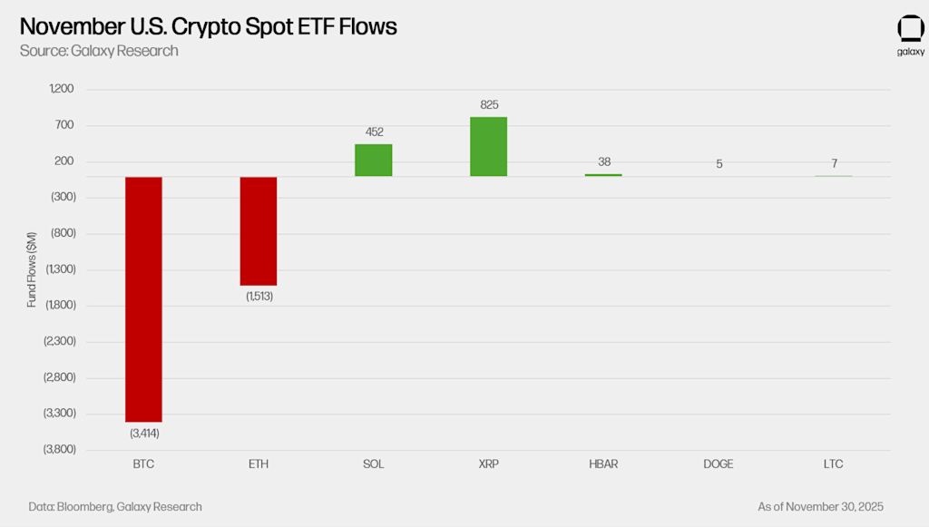 Since the SEC’s generic listing approval in September and the altcoin spot ETF launches during October’s government shutdown, November brought yet another wave of new products: four additional spot Solana ETFs, four new XRP ETFs, and two DOGE ETFs. Despite the broader crypto market downturn, these altcoin ETFs attracted robust inflows.