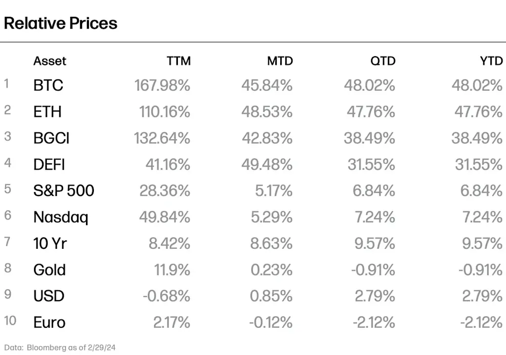 Augmented by spot BTC ETF inflows, bitcoin rose as high as $64,000 in February. Over the course of the last month, the newly minted spot BTC ETFs cumulatively brought in $8.7B and collectively topped $20B in AUM since inception. While spot bitcoin ETFs collectively hold a 1% share of the alternatives ETF market, bitcoin ETFs constituted 12% of the category’s monthly flows in a clear sign of outsized investor interest. February also saw bitcoin realize its largest monthly candle in its history, increasing its value in the year’s shortest month by +$18,000. The last time BTC’s price grew in a similar magnitude, October 2021, it proceeded to reach new all-time highs in the following month.