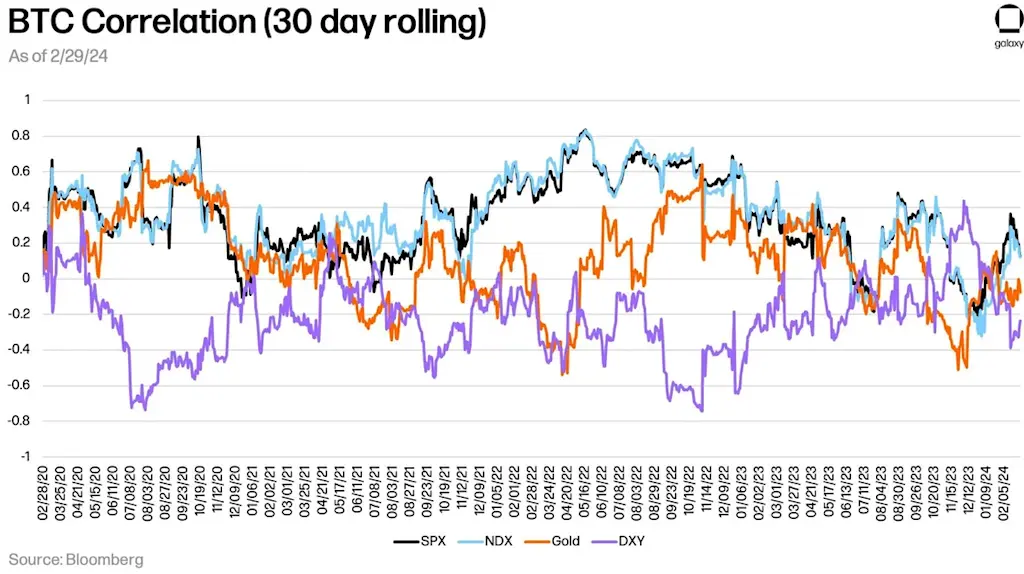 February saw bitcoin recapture $60,000, touching price levels not seen since November 2021. Bitcoin’s strong performance this past month, its best month over month performance since December 2020, had it within 10% of all-time highs. Despite these numbers being unfathomable to even the most bullish investors a year ago, Galaxy’s Head of Research Alex Thorn believes we have further room to run. Catalysts include the steady mass inflows into the U.S. spot BTC ETFs, the resurgence in futures open interest, the significant number of long-term bitcoin holders, and retail interest is starting to return to the market with Coinbase consumer trading volume up to 16% of the last market peak.