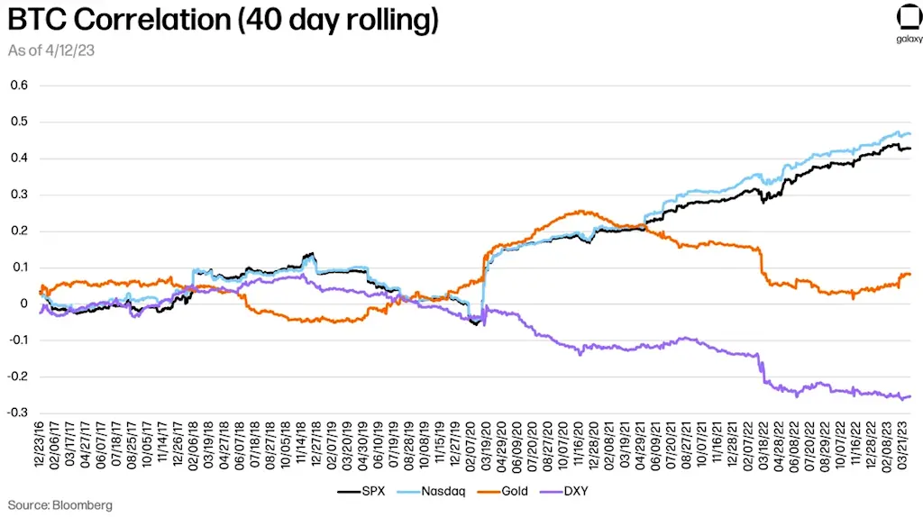 In efforts to reduce further banking panic, the Fed implemented new loan facilities to help banks meet depositor needs. In doing so, the Fed expanded its balance sheet up to levels not seen since last November, effectively undoing much of the recent quantitative tightening. As a result, a weaker dollar was another contributing factor in propelling BTC higher. BTC saw a reduced correlation with equites while its correlation to gold trended higher. We’re beginning to see examples of BTC’s long term use case as a store of value and risk mitigation during volatility markets.