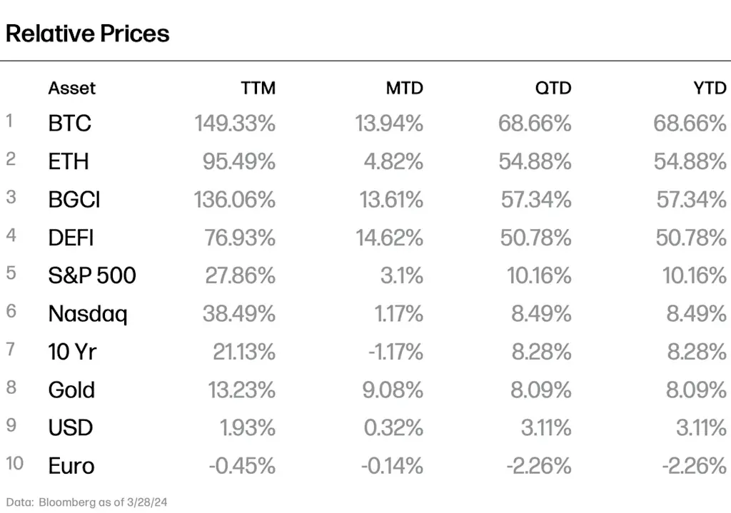 March continued the positive digital assets price trajectory with bitcoin reaching a new all-time high. For the month BTC gained +13.94%, ETH increased +4.82%, and the Bloomberg Galaxy Crypto Index rose +19.54%. As we reflect on the year’s first quarter, it is readily apparent confidence has returned to crypto markets.