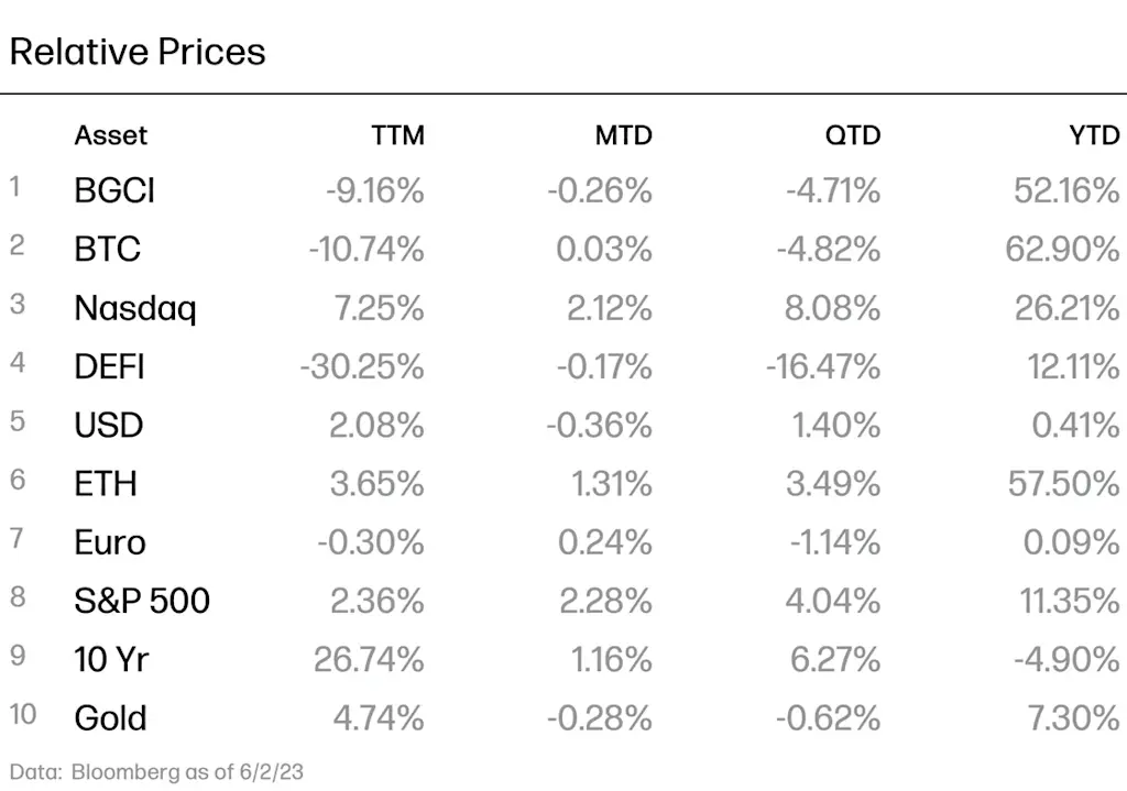 Crypto markets sold off over the month of May (BTC: -7.5%, ETH: -1%) amid tepid performance in broader risk assets and strength in the U.S. dollar. Summer appears to have come early for financial markets, but especially for crypto, as monthly crypto exchange volumes of $424b are down to the lowest level of the year, down 72% compared with May of 2022. It is worth remembering, however, that May of last year marked the beginning of the great crypto deleveraging, as algorithmic stablecoin UST famously broke it’s peg on May 11th, 2022, wiping out more than $60b of value within hours.