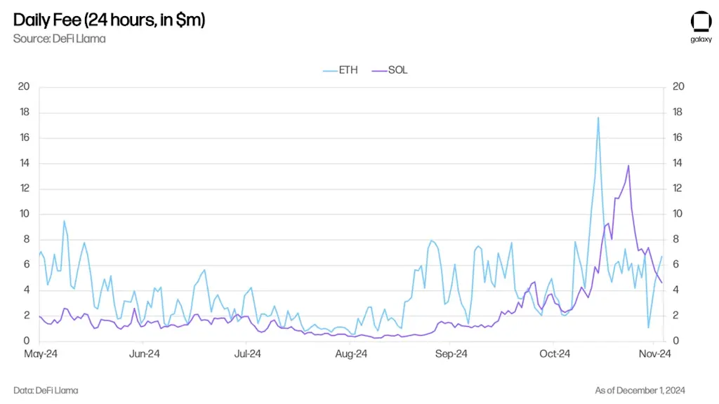 A significant portion of Solana’s activity since March 2024 has been linked to memecoin trading and DEXs that support such activities. Solana’s appeal lies in its ability to process transactions with lower fees and minimal latency, making it attractive to younger, accessibility-focused users. While this has resulted in higher transaction counts, it has not translated to higher revenue compared to Ethereum. Due to its inherently lower transaction costs, Solana would require significantly more activity to generate fees comparable to Ethereum. Although Solana has occasionally outperformed Ethereum in terms of fees, the post-election rally marked a significant turning point. On November 22, as Bitcoin approached the $100,000 threshold, Solana’s aggregated fees exceeded Ethereum’s by $8 million—the largest gap recorded between the two leading Layer 1 blockchains.