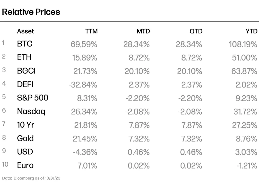 Digital asset markets displayed resilience in October, with BTC posting an impressive +28.34% monthly gain, ETH appreciating +8.72%, and the Bloomberg Galaxy Crypto Index appreciating +20.10%. The surge in Bitcoin’s price was largely driven by the anticipation surrounding the potential approval of a spot BTC ETF.