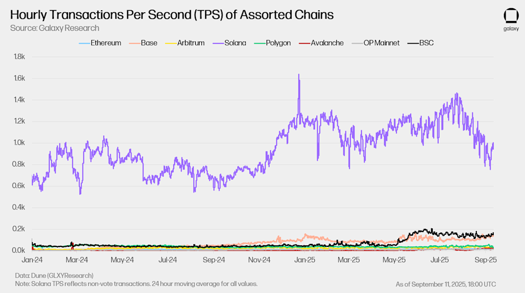 Solana has consistently ranked at the top of major blockchains in terms of block space demand and application-level value creation. Over the past two years, it has maintained the highest throughput among leading chains, processing activity at multiples of competitors such as Ethereum’s L2 Base, Binance Smart Chain, and Arbitrum. Even in periods of slower usage, Solana processes several times more transactions per second than other networks, a sign of capacity and sustained demand for its block space.