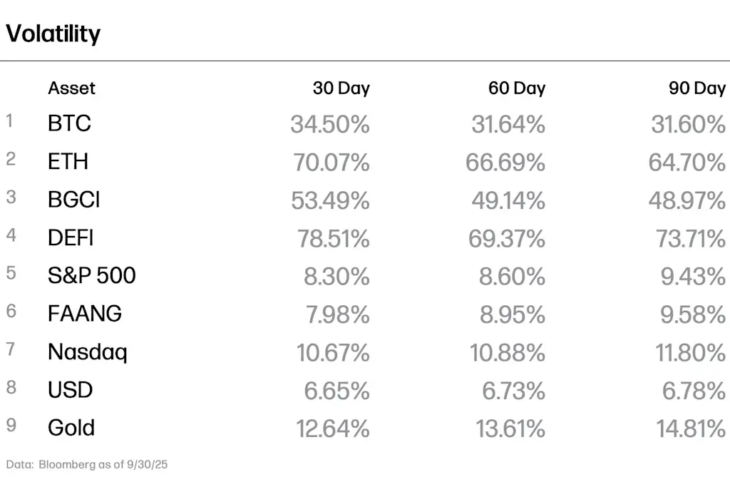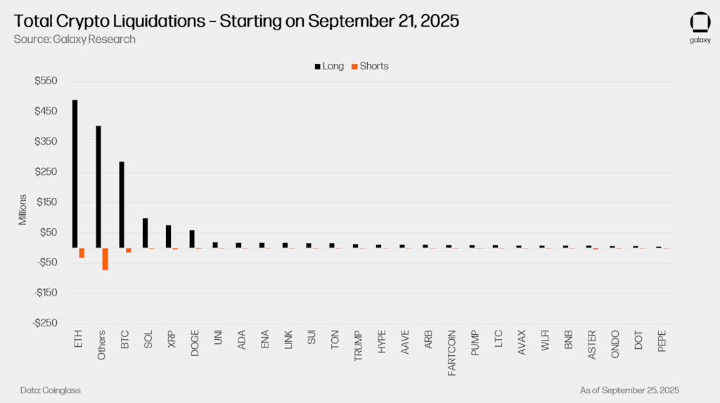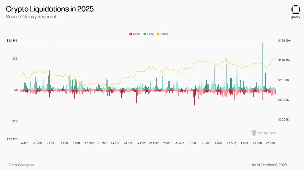 However, crypto endured its sharpest liquidation event since early 2021 in the last week of September. A wave of forced unwinds in BTC and ETH derivatives briefly pushed BTC below $110,000, ETH below $4,000 and drained leverage across the market. The selloff was short-lived, however, as ETF flows and institutional accumulation stabilized sentiment and reset positioning.