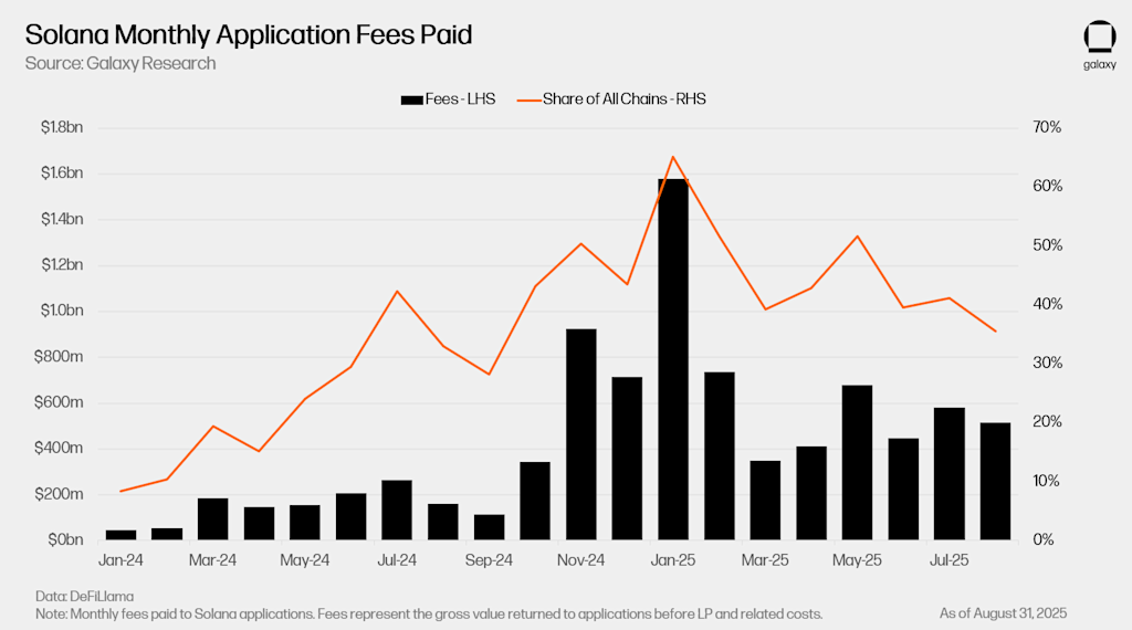 That demand translates directly into economic activity. For nearly a year, Solana has led all blockchains in fees paid to applications, a measure of the gross value users pay for things like swaps or borrowing on DeFi protocols. On average, Solana has captured close to half of all application-level fees across blockchains in 2025, underscoring its ability to generate and retain real economic value at scale.
