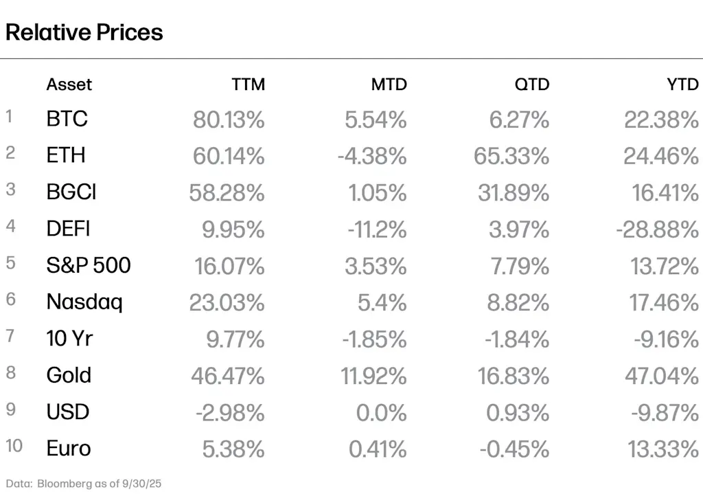 We remain optimistic heading into October. The month has opened with strong momentum as BTC surged above $123,000 and ETH moved back above $4,500, even against the backdrop of a government shutdown. Macro conditions remain supportive, with the Fed cutting rates in a resilient economy, equities at record highs, and gold extending its rally.