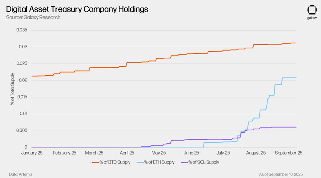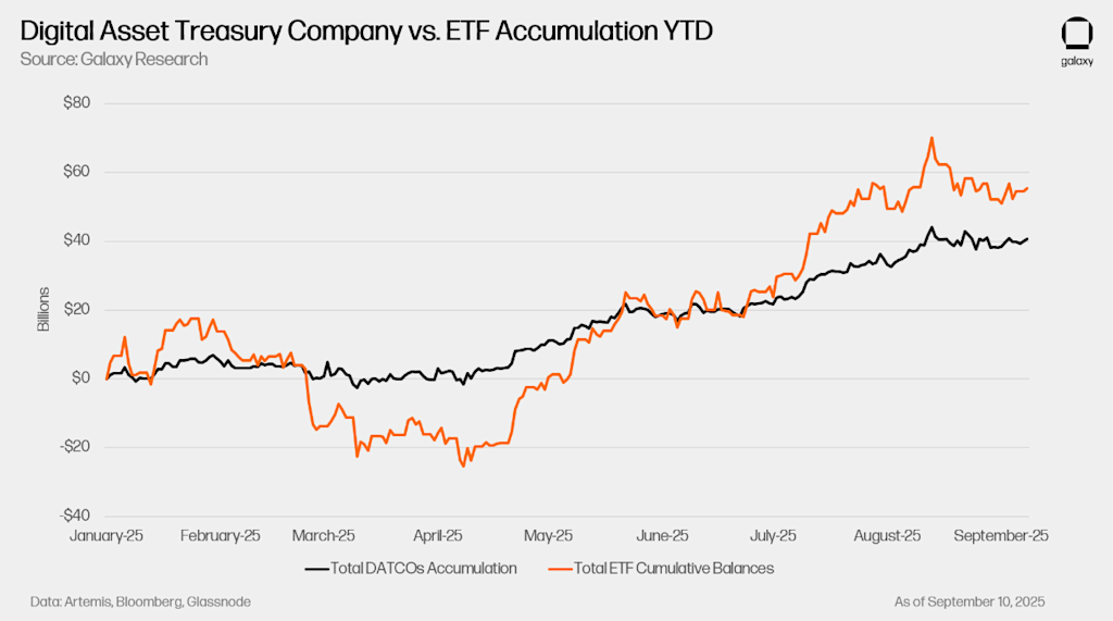 When compared with ETF flows, DATCO activity looks modest. July and August saw stronger inflows from ETFs than from DATCOs, with cumulative ETF balances pulling ahead of DATCO accumulation.