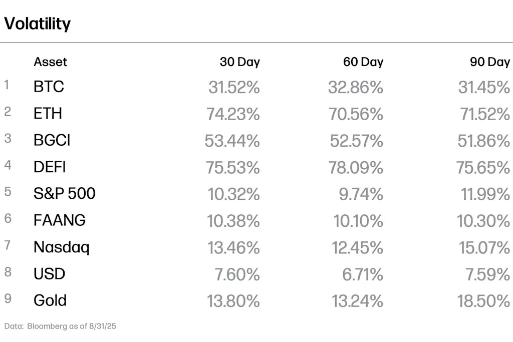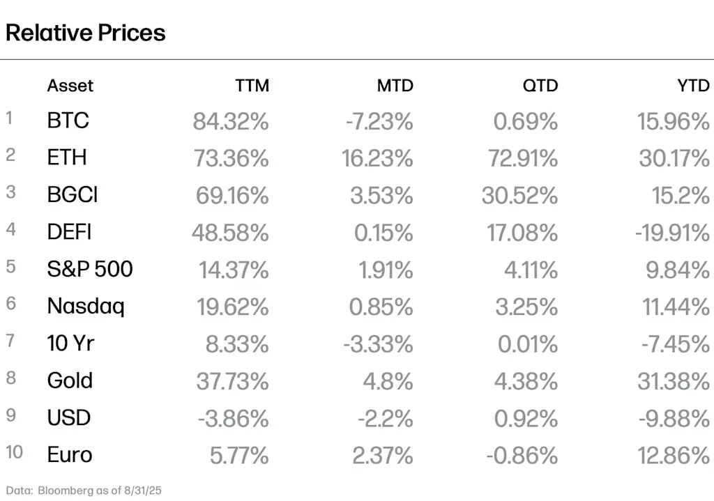 ETH led the market higher in the first half of August, outpacing BTC and driving a broad rally in altcoins, measured by the Bloomberg Galaxy Crypto Index (BGCI). On Aug. 13, BTC hit a new all-time high of $124,496 before reversing and ending the month at $109,127, below its starting level of $116,491. A week later, ETH broke through its previous cycle ceiling on Aug. 22, reaching $4,953 and surpassing the November 2021 high of $4,866, ending a four-year consolidation.