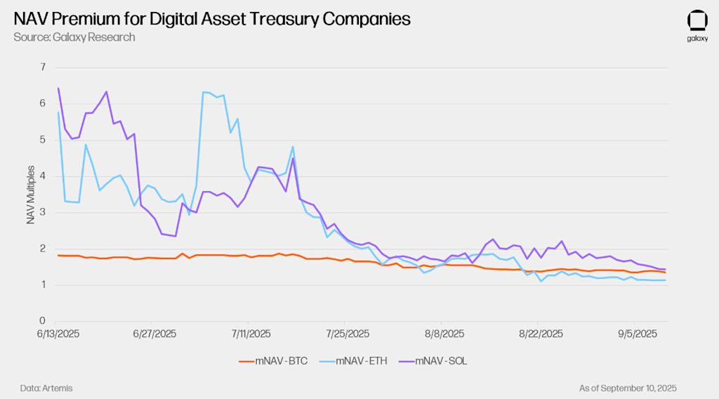 This divergence is becoming more visible as premiums for DATCO stocks have compressed across the board. Where earlier this summer DATCOs traded at multiples well above their net asset value, premiums have drifted down toward parity, signaling more caution from equity investors. That shift is visible in share prices: KindlyMD (parent of Nakamoto) has fallen to about $5 from its late May peak near $25, while Bitmine has slipped from $62 in early August to around $46.