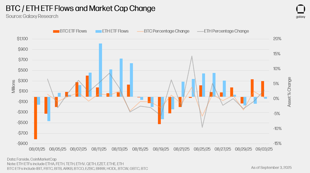 ETH’s strength was particularly notable given its underperformance for much of this cycle. Since bottoming near $1,400 in April, ETH has more than tripled in price, propelled by strong ETF flows and purchases by DATCOs. U.S. spot ETH ETFs logged roughly $4 billion in net inflows during August, their second-strongest month after July, compared to net outflows of roughly $639 million from U.S. spot BTC ETFs.