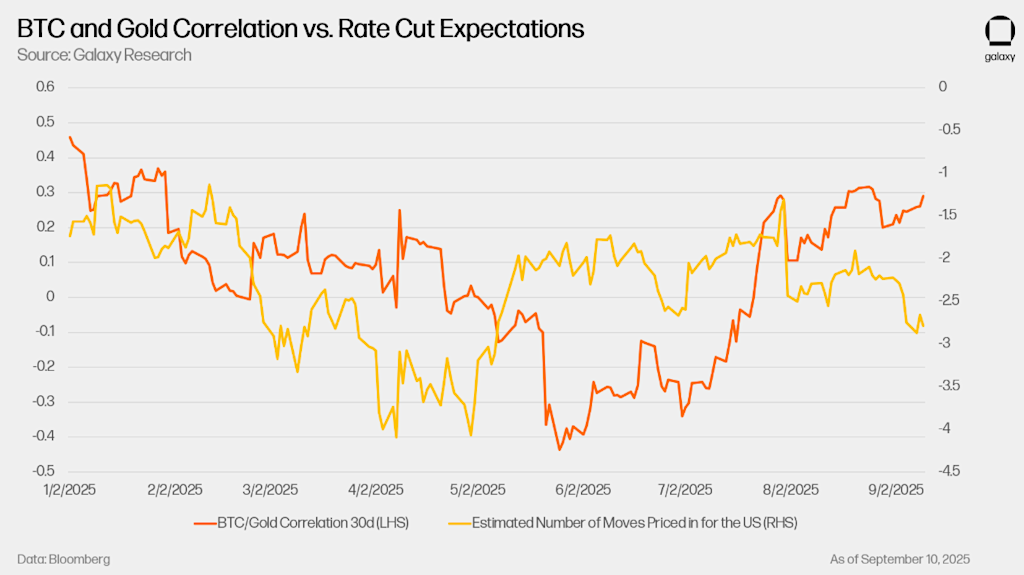 However, BTC ETF flows turned positive even though spot prices slipped in the last two weeks of August. Growing expectations for aggressive Fed rate cuts brought the store-of-value narrative back into focus, with BTC’s correlation to gold strengthening through the month as rate cuts appeared more likely.